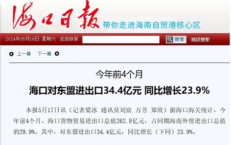 近日,海口日报在“今年前4个月,海口对东盟进出口34.4亿元,同比增长23.9%”的新闻报道中,对普利制药在海口进出...