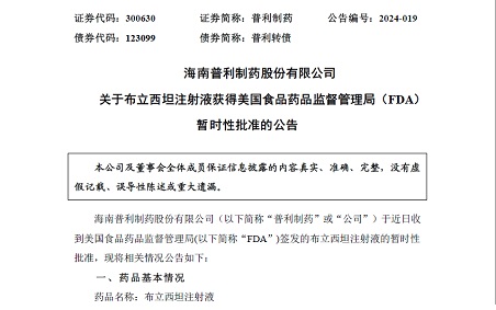 【2024年第4张美国ANDA】普利制药布立西坦注射液获得美国暂时性批准!